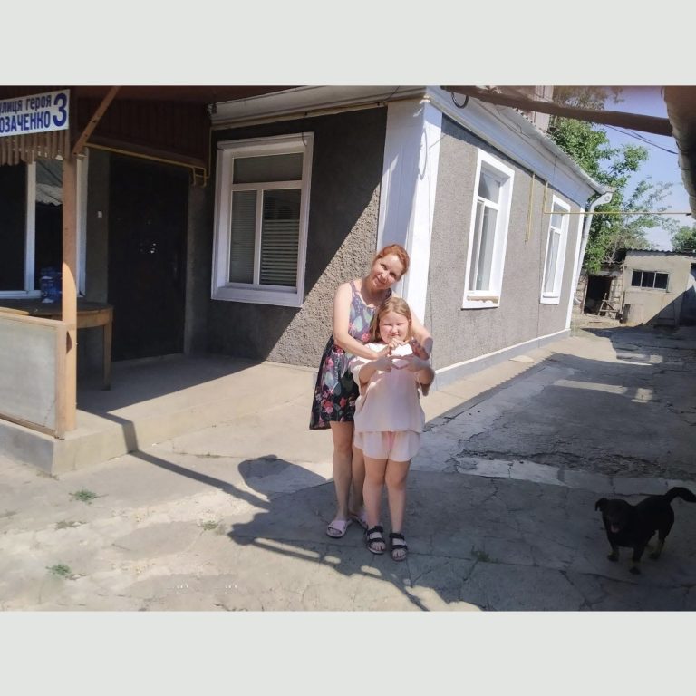 Natalia Schewschenko mit einer ihrer Töchter vor ihrem neuen Zuhause im Oblast Odessa, das sie mit unserer Hilfe gekauft haben.